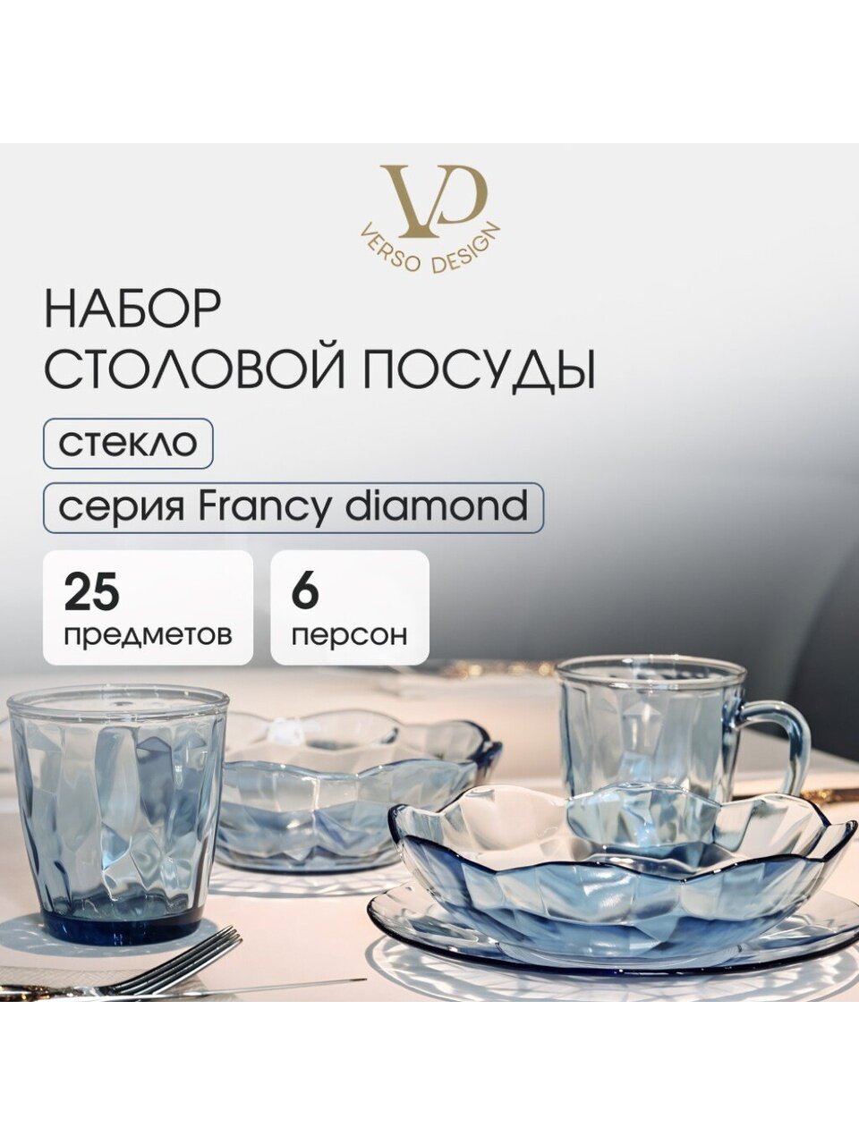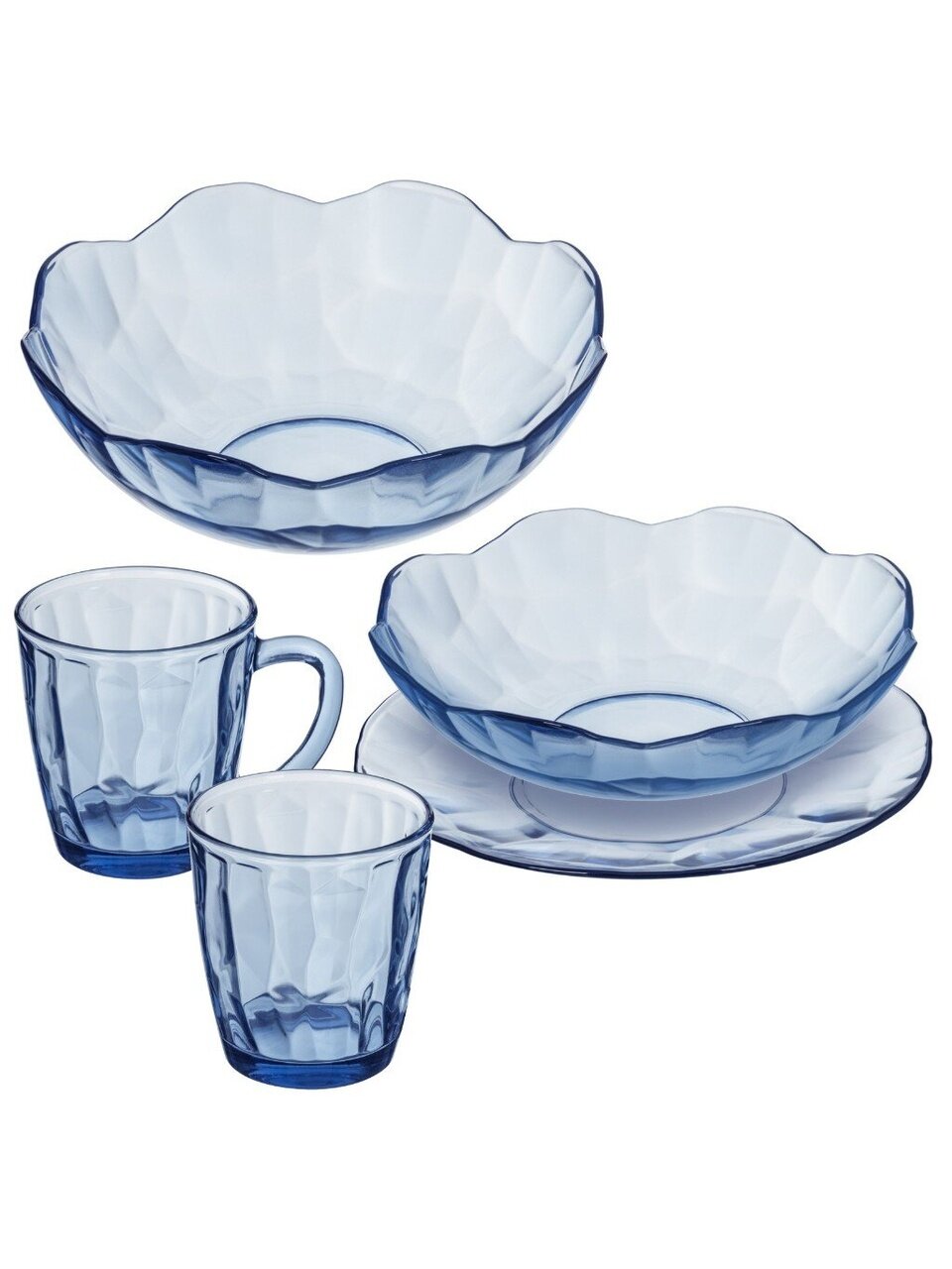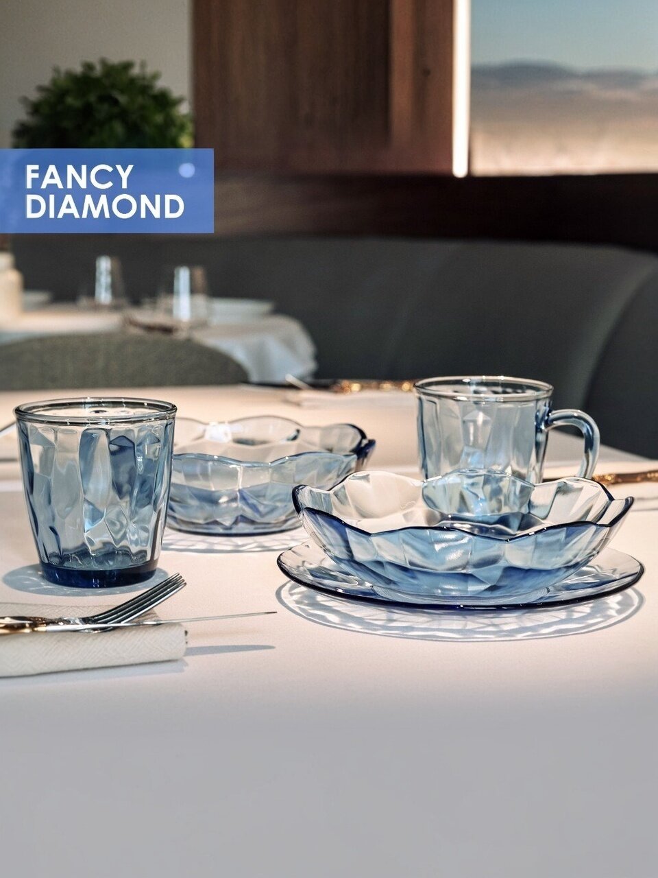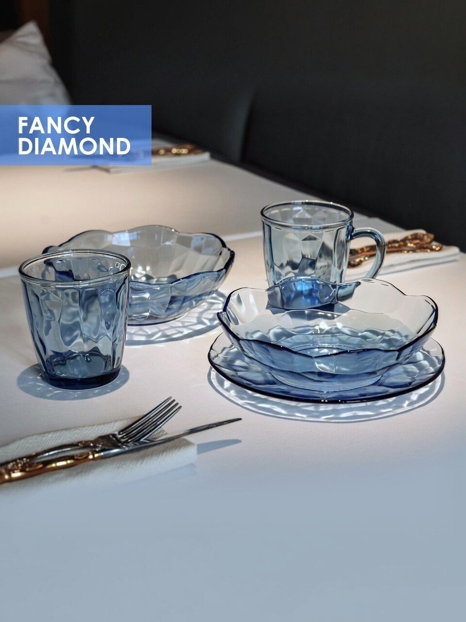 Столовый сервиз Francy diamond на 6 персон: 25 предметов из прочного голубого стекла — для стильной сервировки дома, дачи или подарка. Можно мыть в посудомоечной машине и использовать в СВЧ.