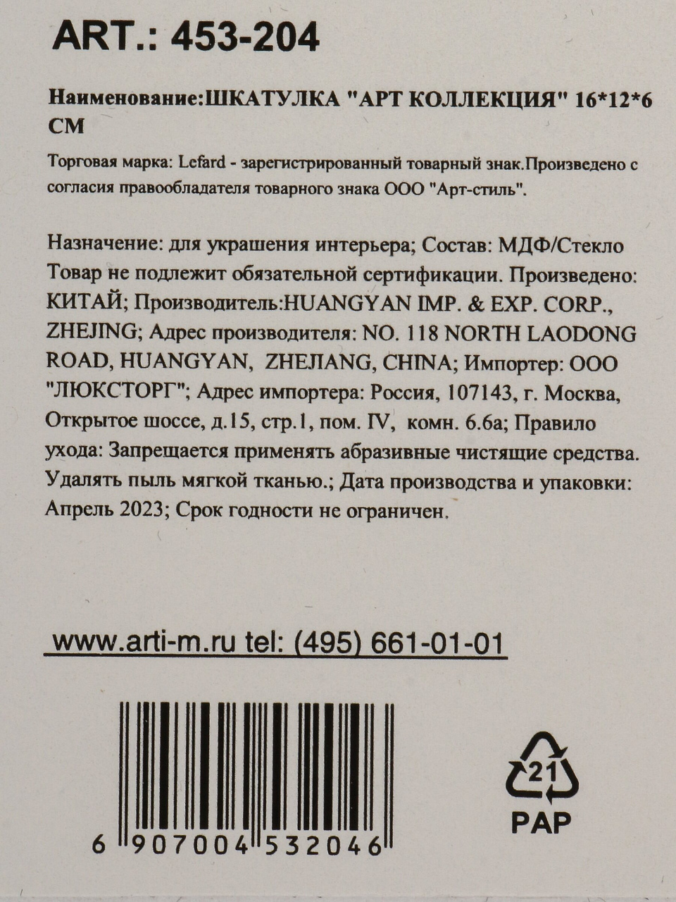 Вы можете приобрести «Шкатулка для украшений, МДФ, стекло, 16х12х6 см, Lefard, Арт Коллекция, 453-204» и другие товары в нашем интернет-магазине в Шахтах по низким ценам и с бесплатным самовывозом.