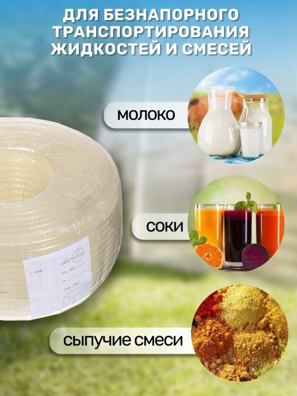Шланги используются для транспортировки жидкостей и сыпучих смесей в сельскохозяйственной и пищевой отраслях, включая прямой контакт с молочными продуктами, соками и так далее.
