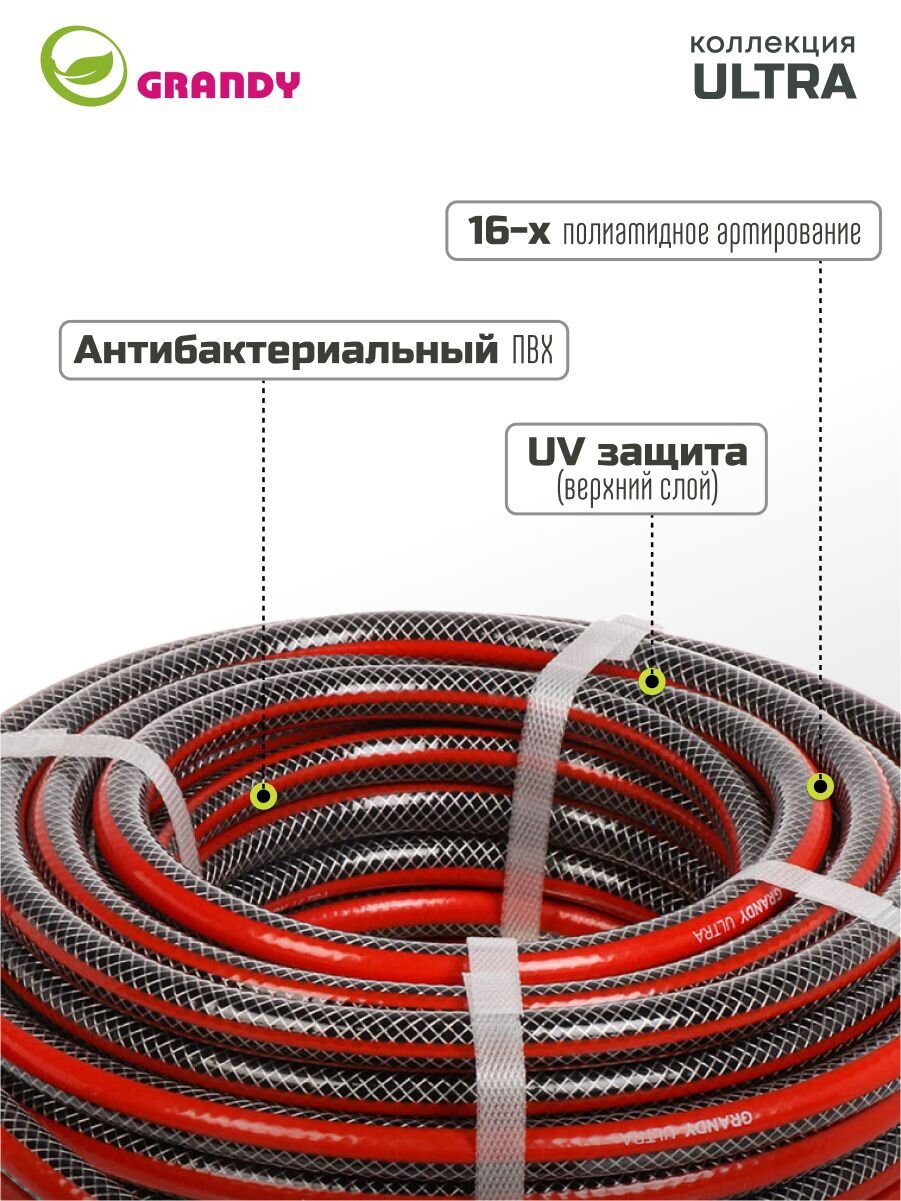 Шланг поливочный армированный Grandy Ultra не подвержен локальным вздутиям, не образует трещин и изломов. Проверен на герметичность, концы шланга запаяны под давлением.