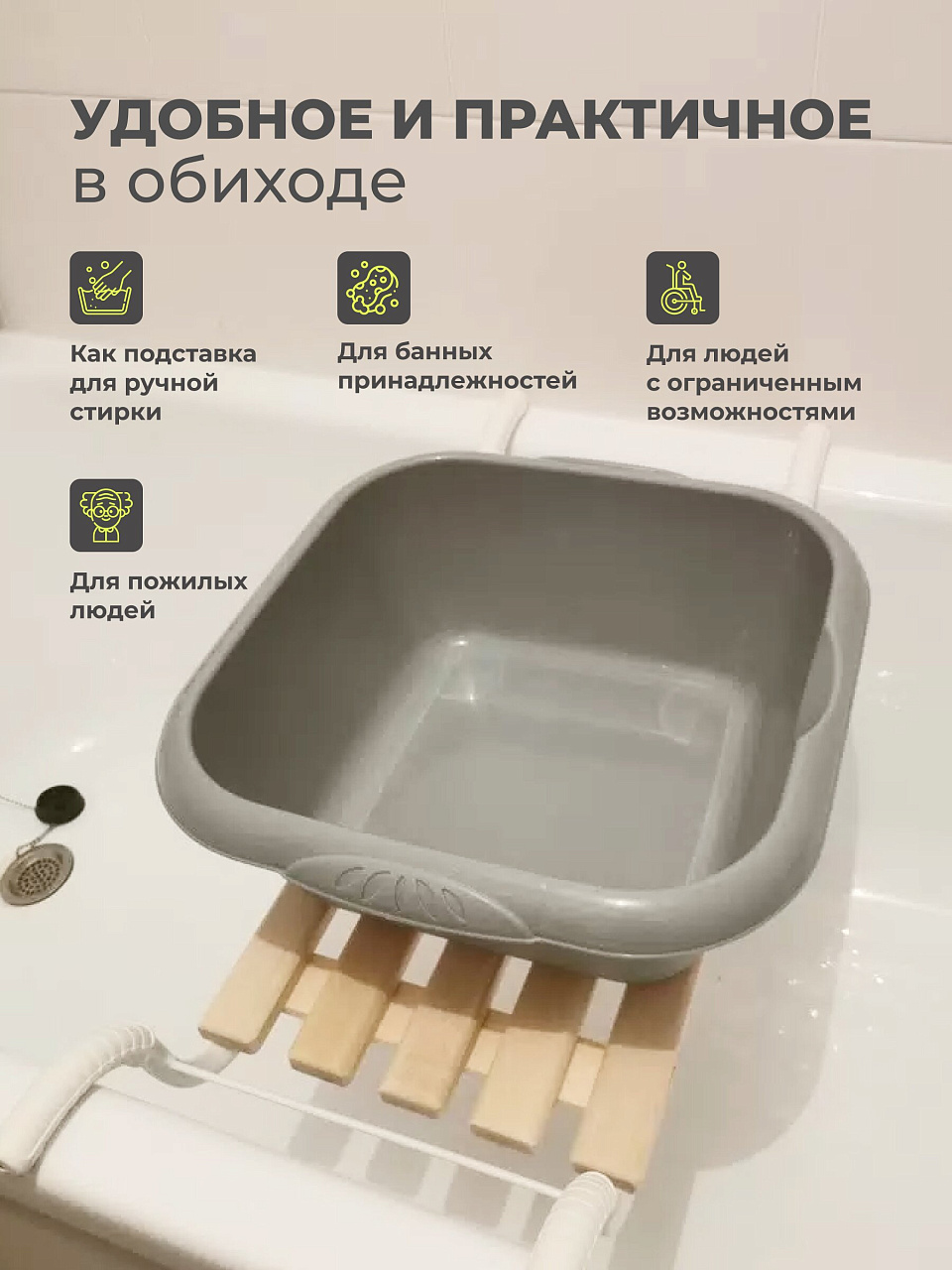 Сиденье для ванны представляет собой пятиреечное сиденье из неокрашенного дерева, закрепленное к каркасу. Ручки выполнены из антискользящих материалов, обеспечивающих конструкции должную устойчивость.