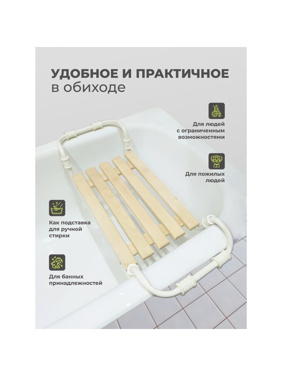 Пятиреечное сиденье из неокрашенного дерева, закрепленное к каркасу. Ручки выполнены из антискользящих материалов, обеспечивающих конструкции должную устойчивость. Регулируется по ширине ванны. Конструкция позволяет менять размер между опорами от 700 мм до 770 мм. Размер сиденья 285х670 мм. Максимальная нагрузка 100 кг.