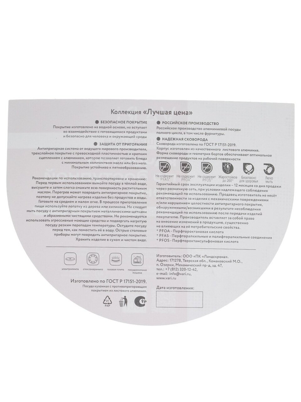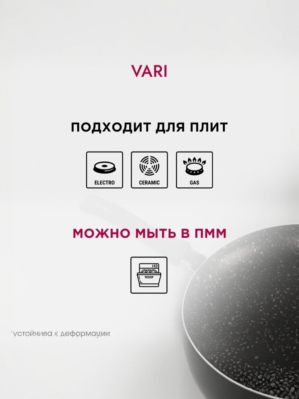 - Антипригарное тефлоновое покрытие Vari — пища не прилипает, легко мыть даже в посудомоечной машине