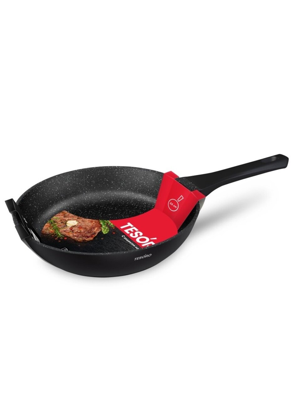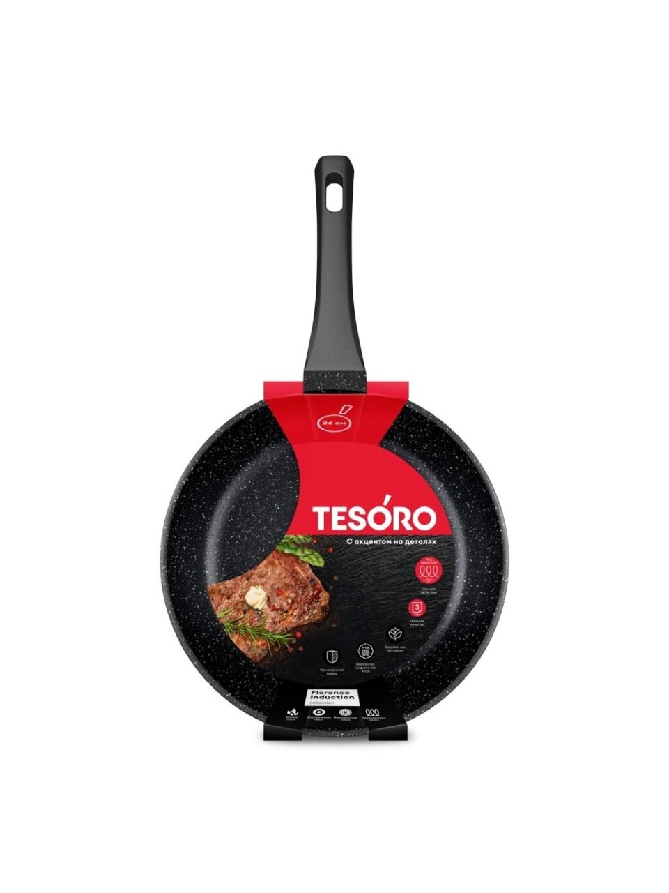 В отличие от обычных штампованных сковород, литой алюминий обеспечивает устойчивость к деформации даже при частом нагреве. Гранитное покрытие позволяет готовить с минимальным количеством масла и легко очищается — сковороду можно мыть в посудомоечной машине. Если вы ищете, какая сковорода лучше для мяса, рыбы, яичницы или оладий — Tesoro Florence универсальна для всех этих целей, а диаметр 26 см оптимален для семейного ужина или готовки на даче.
