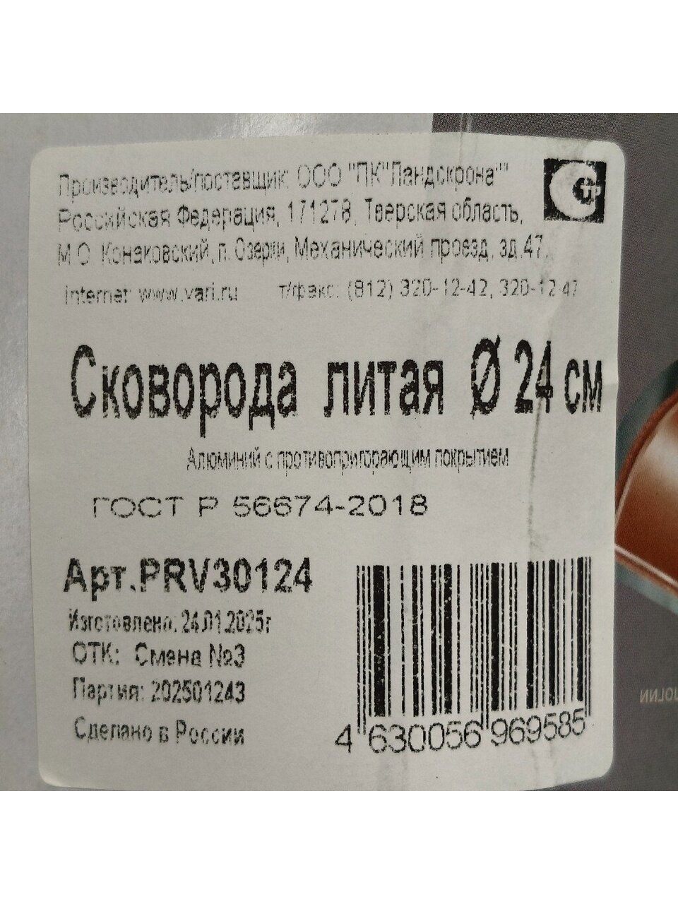 - Оптимальный диаметр 24 см, прочный алюминий, толщина дна 4,5 мм — служит до 36 месяцев