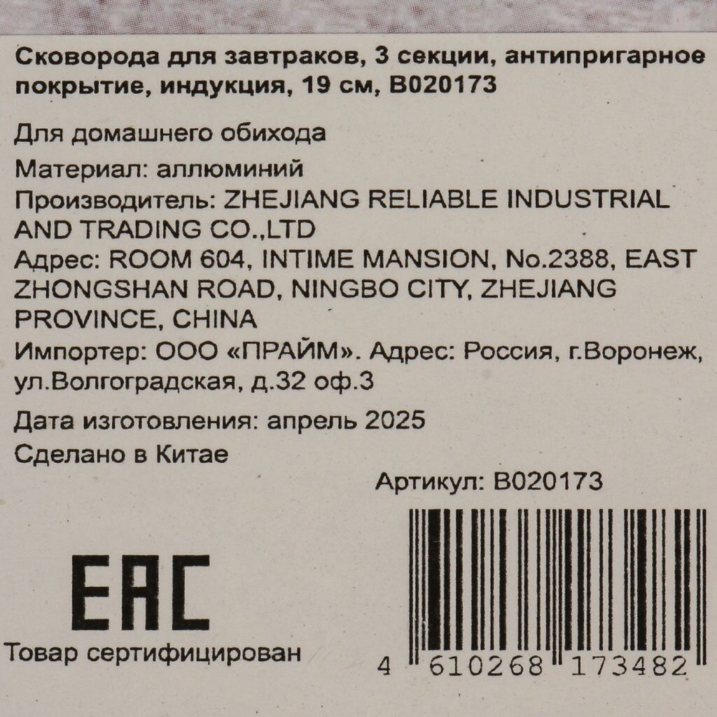 Сковорода для завтраков, 19 см, 3 секции, антиприг, индукция, B020173