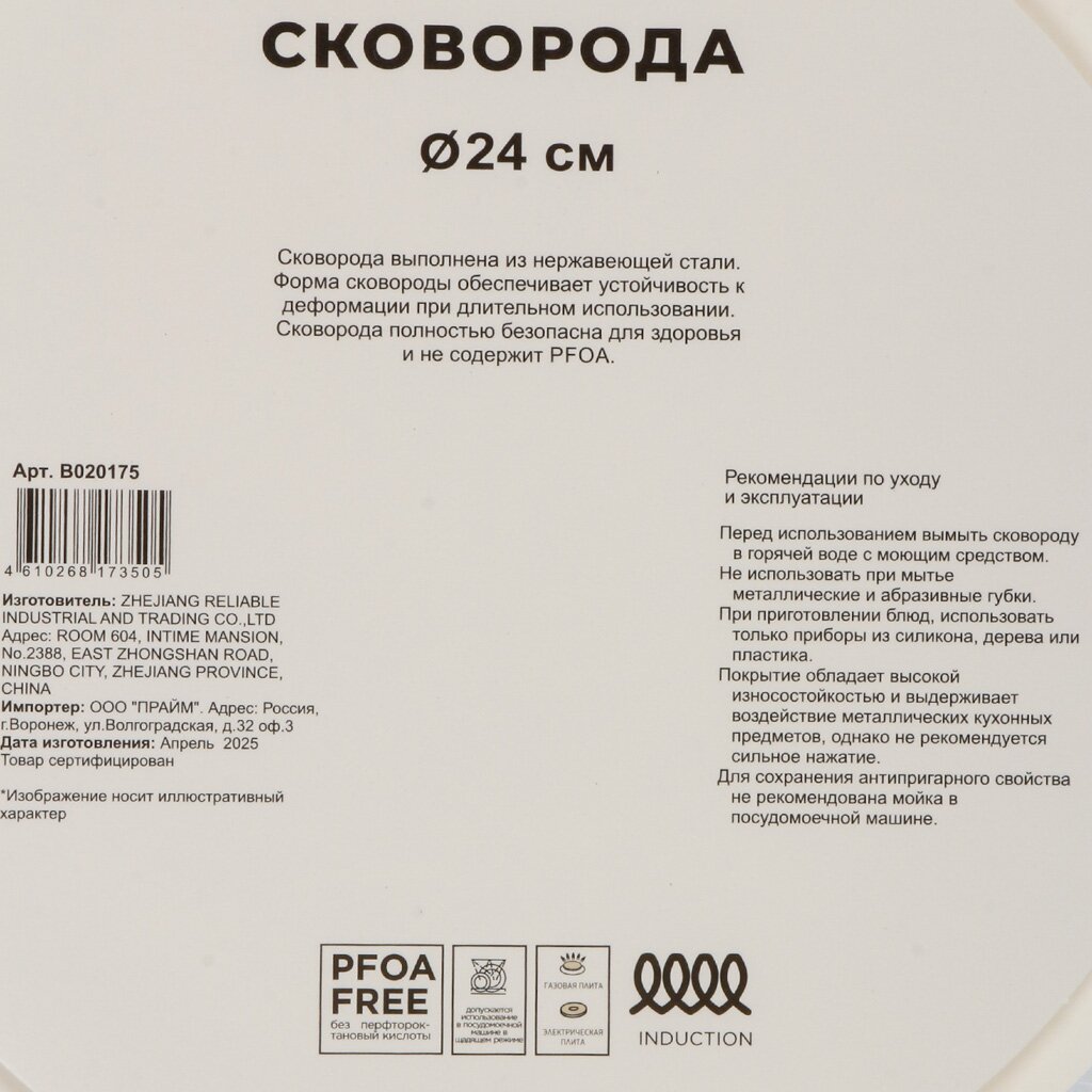 Сковорода нержавеющая сталь, 24 см, антиприг, индукция, HouseLoft, B020175