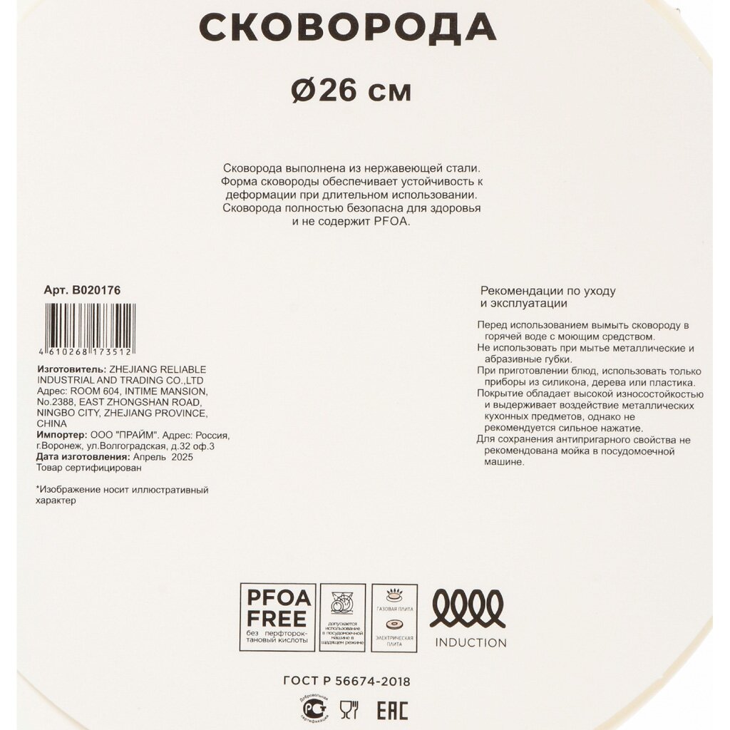 Сковорода нержавеющая сталь, 26 см, антиприг, индукция, HouseLoft, B020176