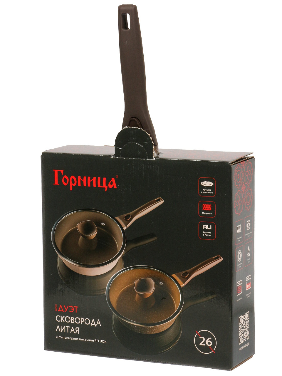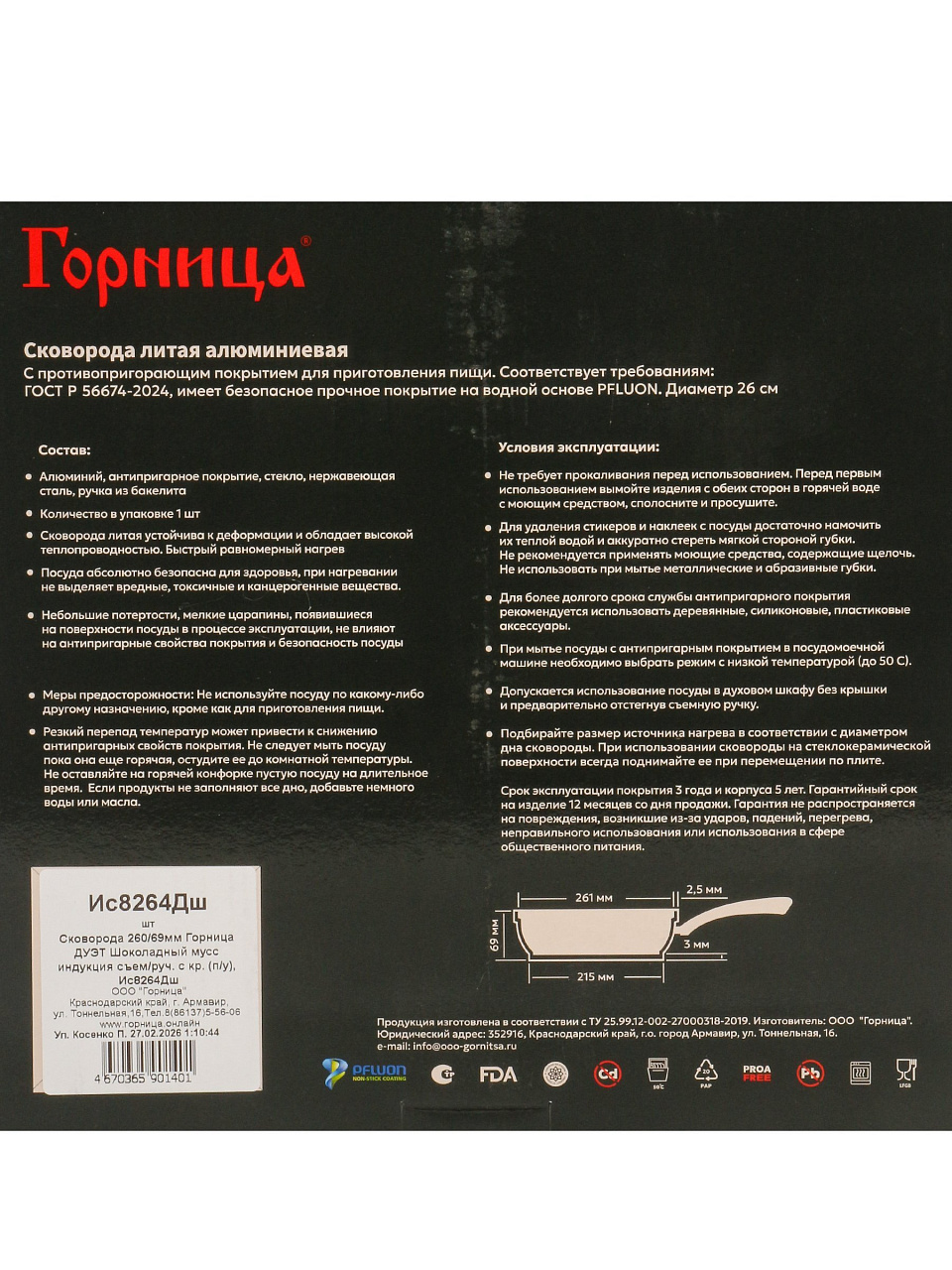 Вы можете приобрести «Сковорода литой алюминий, 26 см, антипригарное покрытие, Горница, Дуэт Шоколадный мусс, с крышкой, съемная ручка, индукция, Ис8264Дш» и другие товары в нашем интернет-магазине в Россоши по низким ценам и с бесплатным самовывозом.