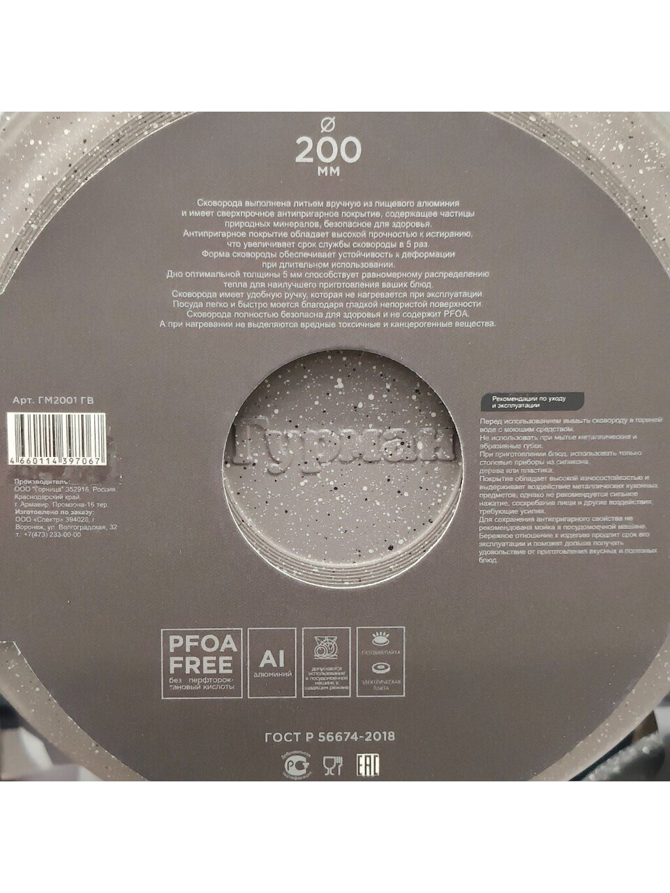 Часто спрашивают: «Чем отличается литая алюминиевая сковорода от прессованной?» Литой алюминий лучше держит тепло, не деформируется со временем, а мраморное покрытие устойчиво к царапинам и дольше сохраняет свои свойства. Если вы выбираете, какая сковорода лучше для газовой или электрической плиты — модель ГМ2001 ГВ подойдёт для всех типов, кроме индукции. Высокие борта (4,5 см) и диаметр дна 16 см делают её универсальной для разных блюд и порций.