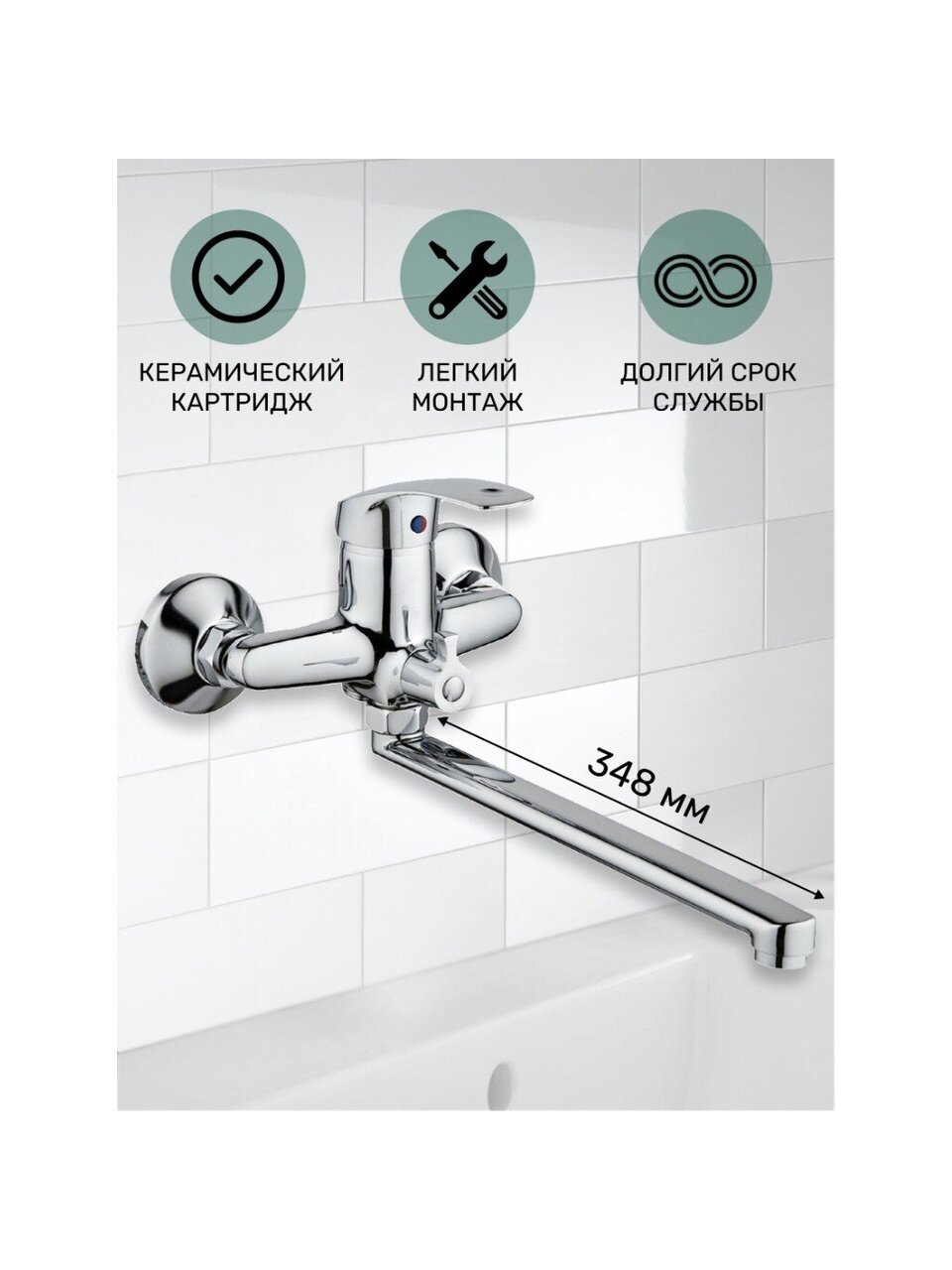 - Долговечность и практичность: корпус из силумина, керамический картридж, длинный поворотный излив 34,8 см, жесткая подводка и аэратор для экономии воды.