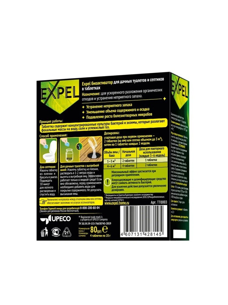 Дозировка: стартовая доза при первом применении – 2 таблетки (на яму или септик до 3 м3), затем по 1 таблетке каждые 2 недели. Срок годности: 3 года с даты изготовления.