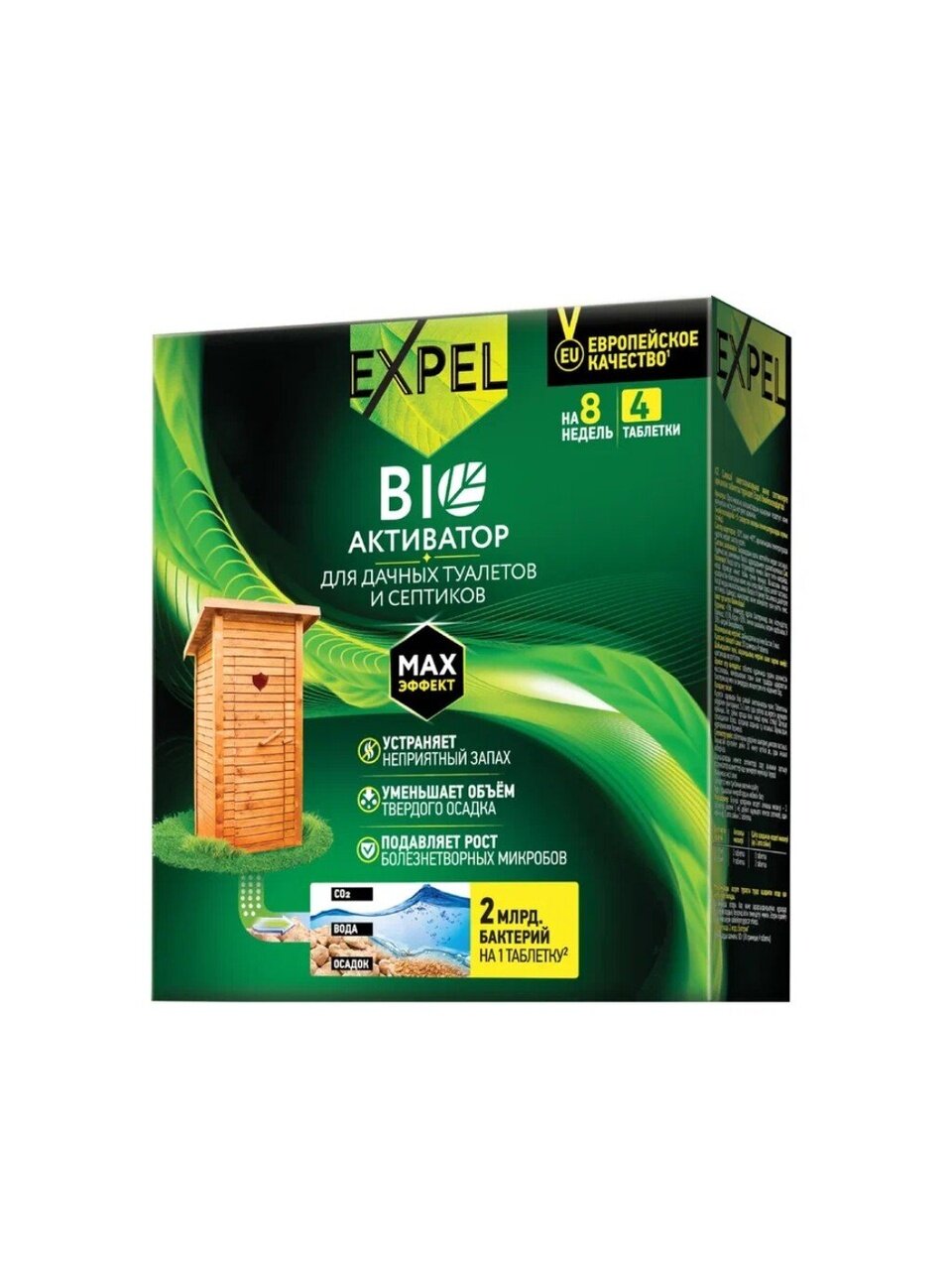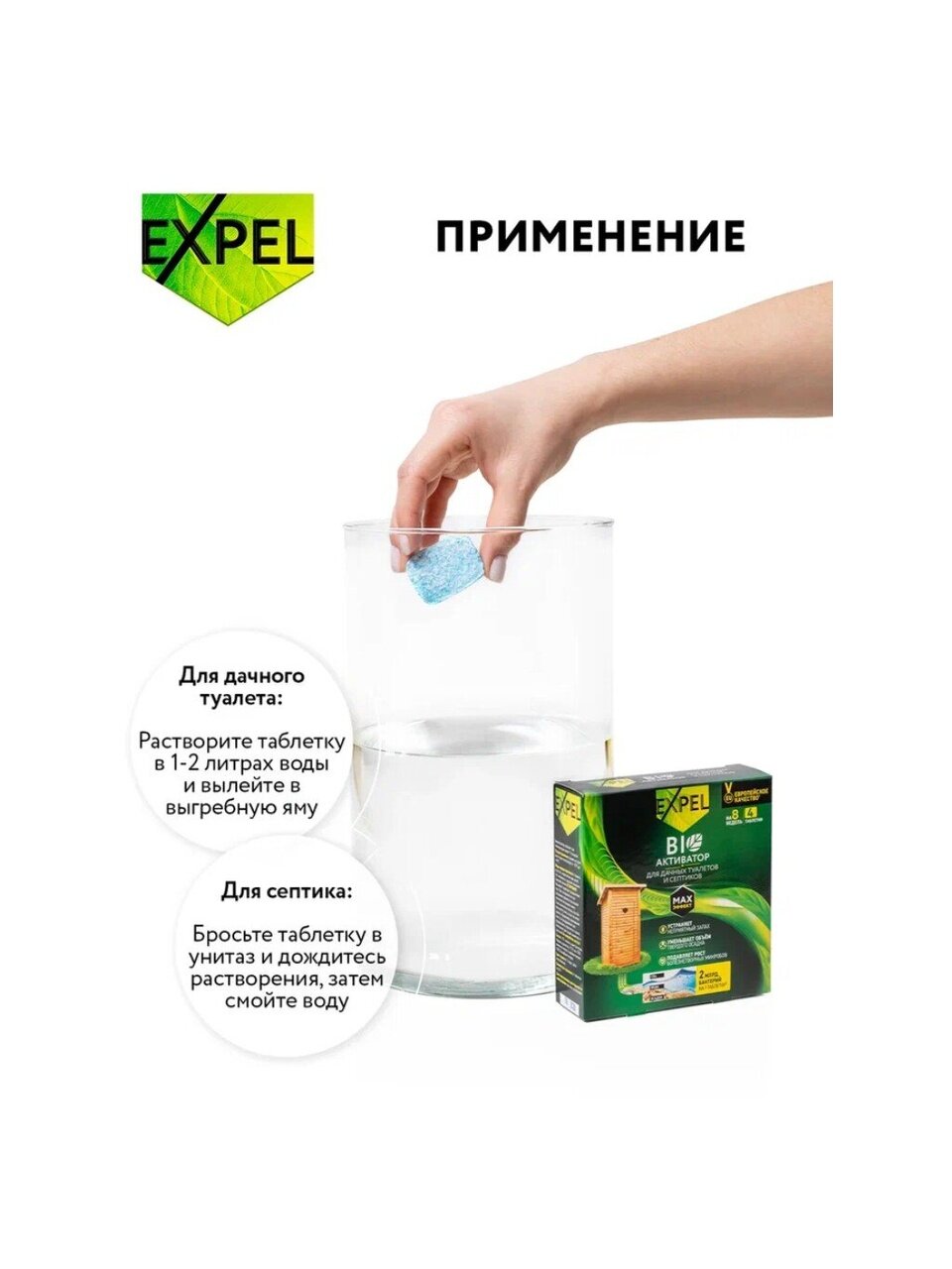Биоактиватор “Expel” содержит концентрированные культуры бактерий, которые разлагают фекальные массы на воду, углекислый газ и соли.