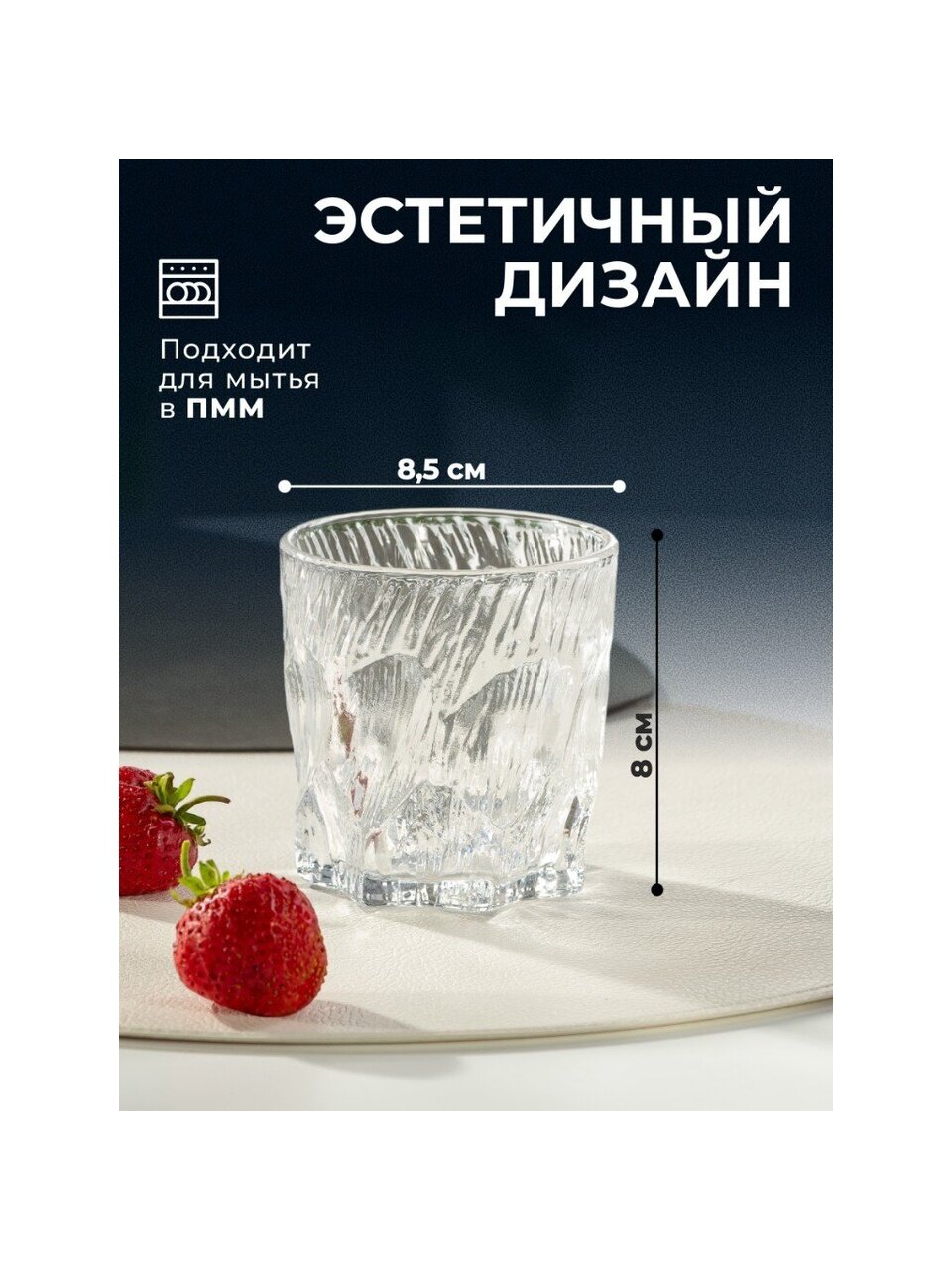 Стакан низкий и широкий, форма рокс, объем 230 мл — удобно держать, устойчив на столе, подходит для воды, сока, компота и коктейлей.