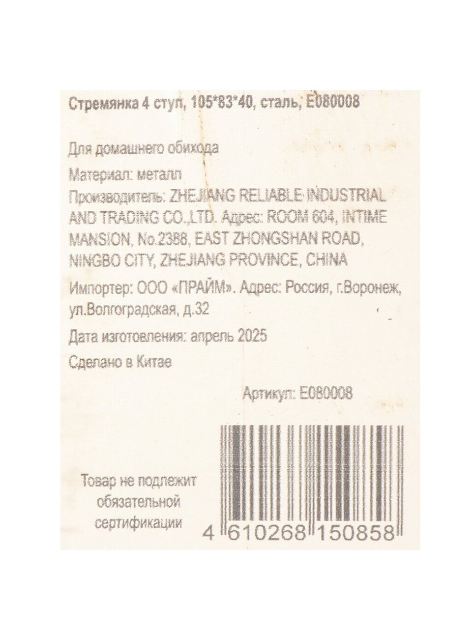 Стремянка 4 ступ, 105х83х40 см из прочной стали — надежное решение для бытовых задач, требующих подъема на высоту. Компактная складная конструкция обеспечивает удобство хранения и транспортировки, делая стремянку идеальным выбором для дома, дачи и квартиры. Высокая прочность стали гарантирует долгий срок службы и устойчивость при эксплуатации, а четыре ступени позволяют легко и безопасно дотянуться до верхних полок, шкафов или провести мелкий ремонт. Современный дизайн стремянки впишется в любой интерьер и станет незаменимым помощником при уборке, ремонте, замене лампочек или размещении предметов на высоте.
