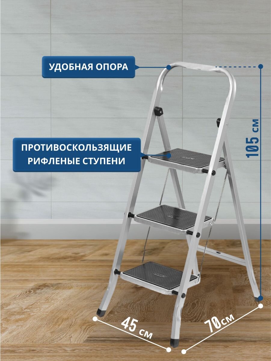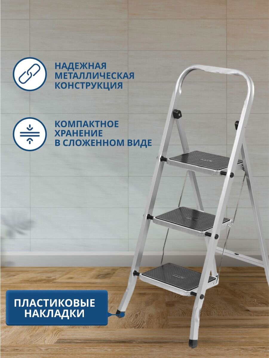 Стремянка стальная с широкими ступенями не только очень полезна во время ремонтных работ, но и удобна для использования на улице благодаря металлической конструкции и накладкам на ступеньках, которые обеспечивают устойчивость на любой поверхности. Она является идеальным инструментом для любых задач, требующих быстрого и удобного доступа к высоким местам.