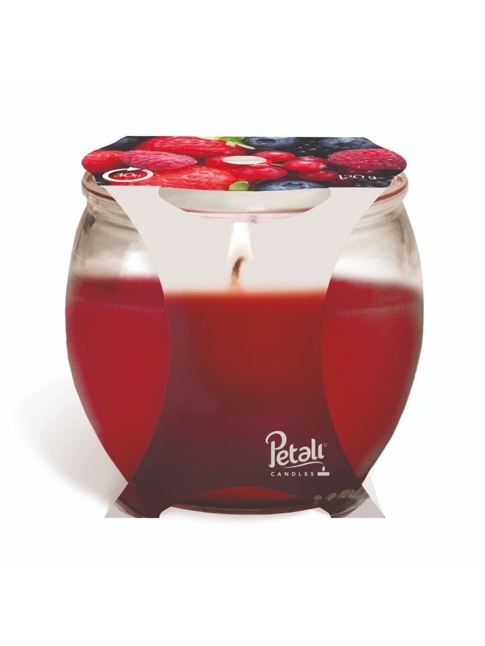 Высота — 7 см, диаметр — 7.5 см, цвет — бордовый, аромат — смешанные ягоды, форма — круглая в стеклянном стакане, без крышки, с подсвечником.