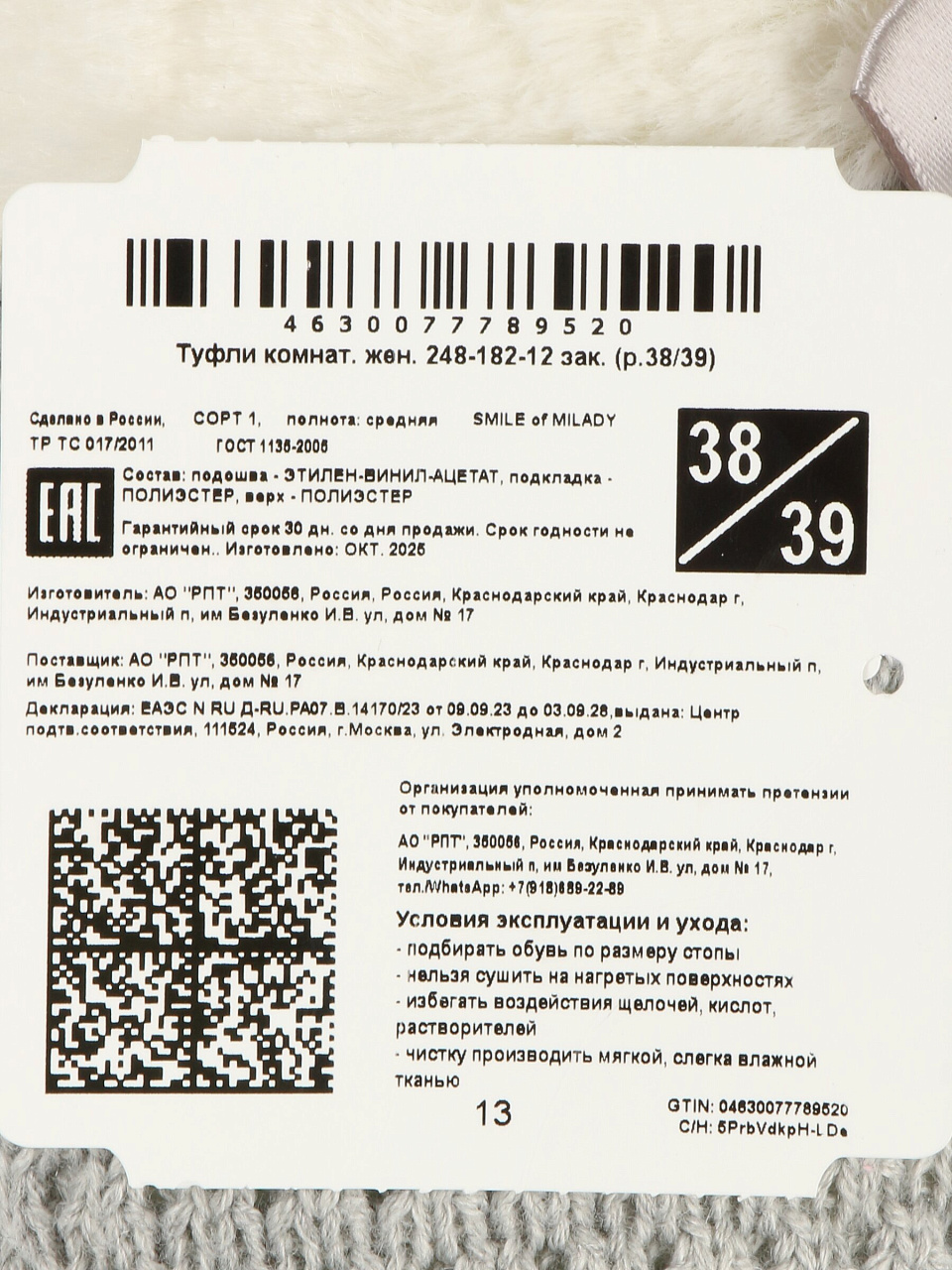 Вы можете приобрести «Тапки для женщин, текстиль, р. 38-39, закрытые, 248-182-12» и другие товары в нашем интернет-магазине в Старом Осколе по низким ценам и с бесплатным самовывозом.