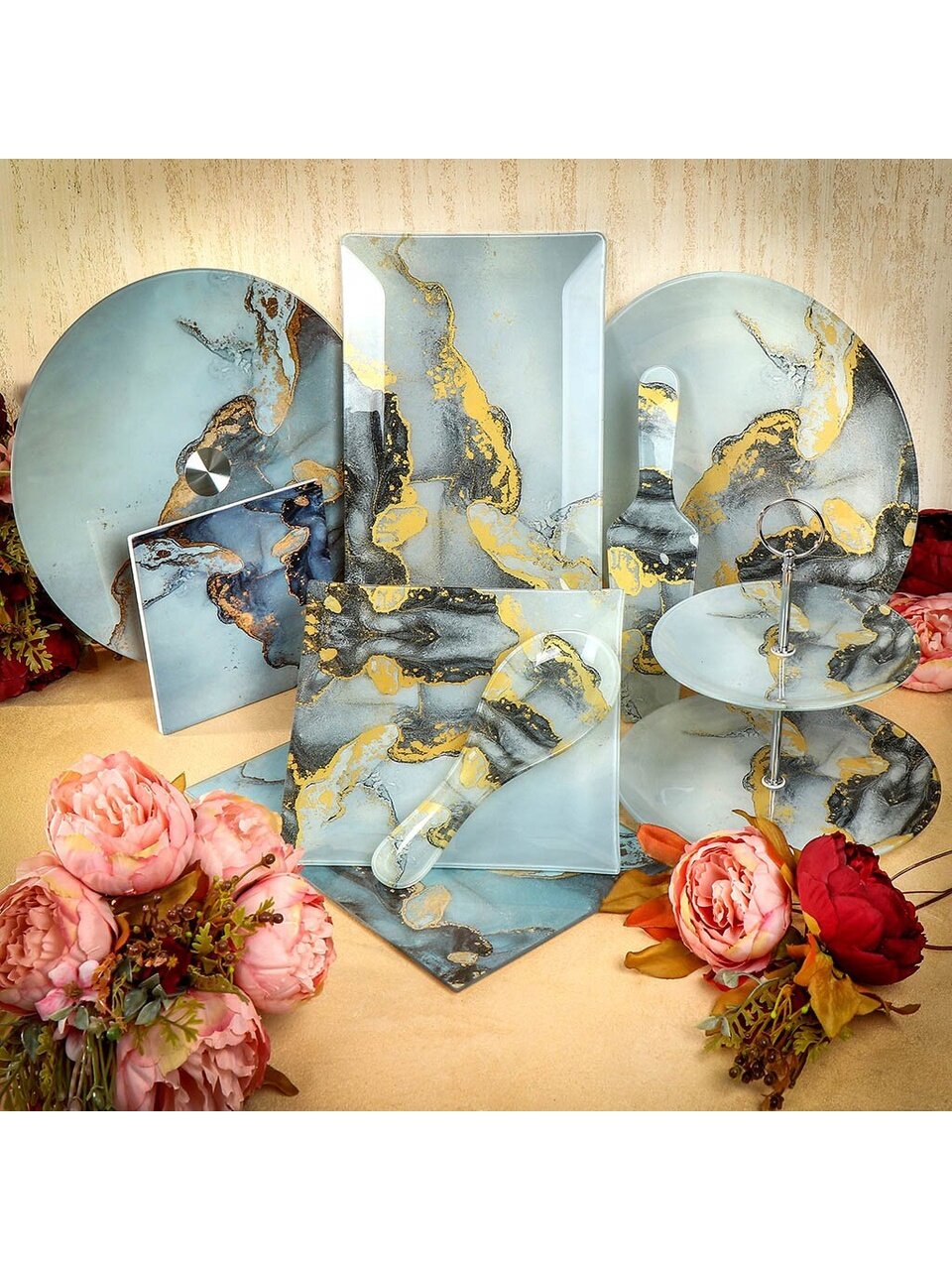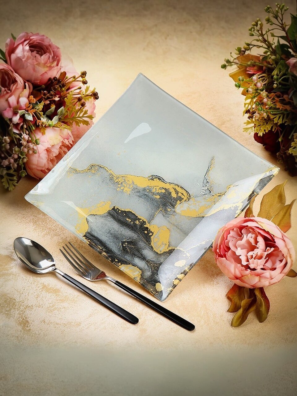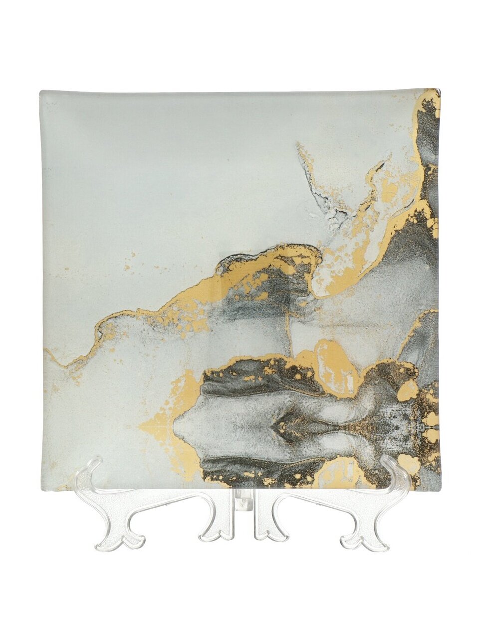Daniks Флюид — квадратная, с абстрактным рисунком «под мрамор», что делает ее стильной альтернативой классическим круглым тарелкам и выгодным выбором для сервировки.