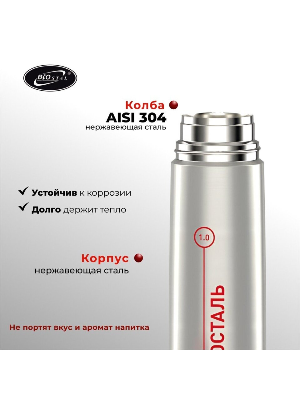 Многие спрашивают, как использовать такой термос для разных напитков и подходит ли он для хранения кофе, чая или холодной воды. Благодаря инновационной конструкции с узкой горловиной и навинчивающейся крышкой, Biostal отлично сохраняет температуру: напитки остаются горячими до 32 часов, а холодными — до 40 часов. В отличие от аналогов с пластиковой колбой, этот термос не впитывает запахи и не изменяет вкус содержимого, что особенно важно для ценителей свежести.