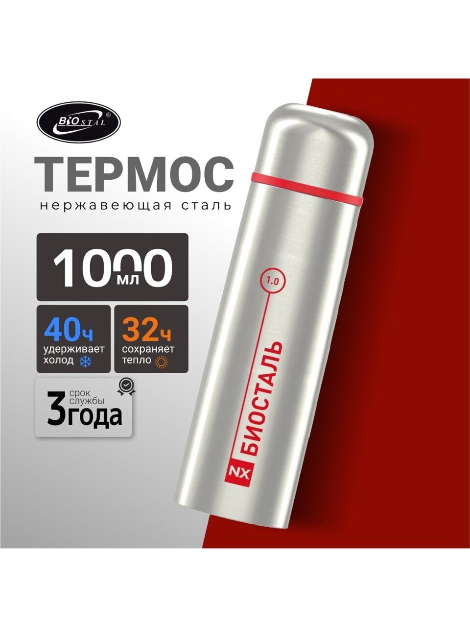 Термос Biostal 1 л — сохраняет тепло до 32 часов, компактный и ударопрочный корпус из нержавеющей стали для города, дома и походов.