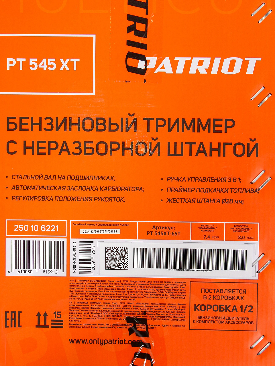 Вы можете приобрести «Триммер бензиновый, Patriot, PT 545 XT(1+1), 2.5 л.с., 43 куб.см, 1840 Вт, U-ручка, леска/нож, неразборный вал» и другие товары в нашем интернет-магазине в Курске по низким ценам и с бесплатным самовывозом.