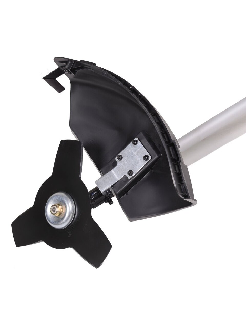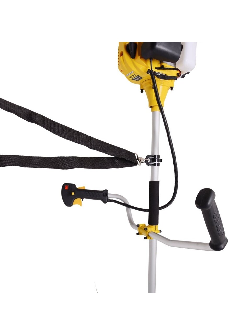 Мотокоса оснащена, так же, угловым редуктором, защитным кожухом и изогнутой (по типу велосипедного руля) рукояткой, на правой стороне которой находятся органы управления, что дает возможность пользоваться ими, не снимая руки. Клавиша газа имеет блокировку и фиксатор. Чтобы руки не так быстро уставали, в комплекте триммера имеется специальный ремень, за который устройство подвешивается на плечо оператора.