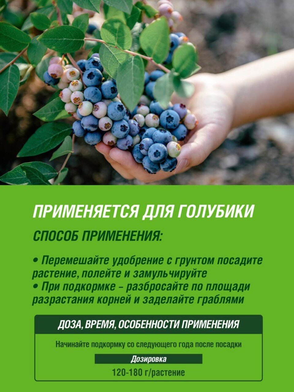- Комплексная органоминеральная формула — оптимальное питание для голубики, усиление цветения и завязи ягод
