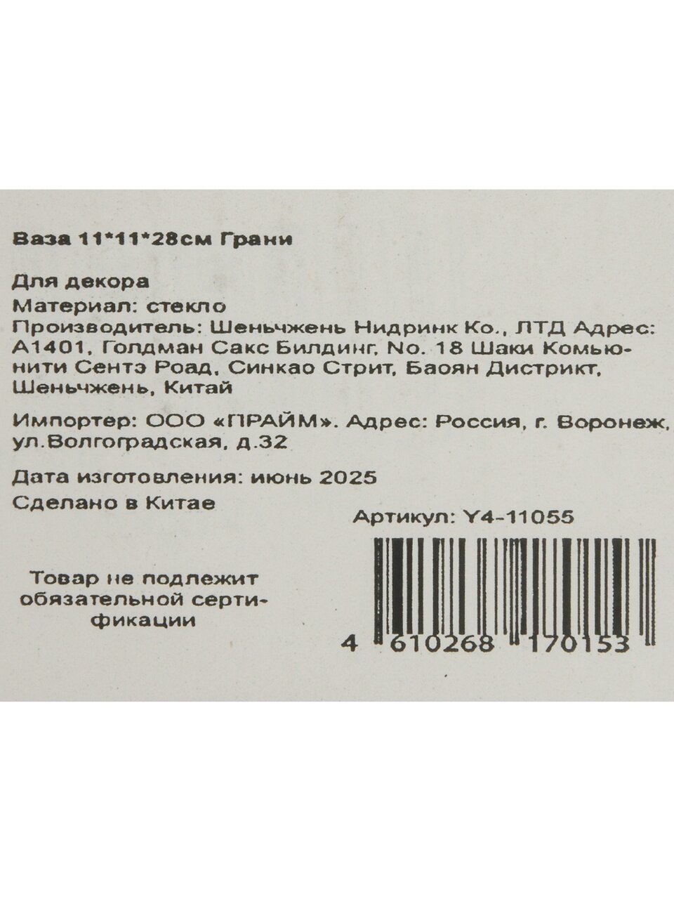 Ваза стекло, настольная, 11*11*29 см, Грани, Y4-11055