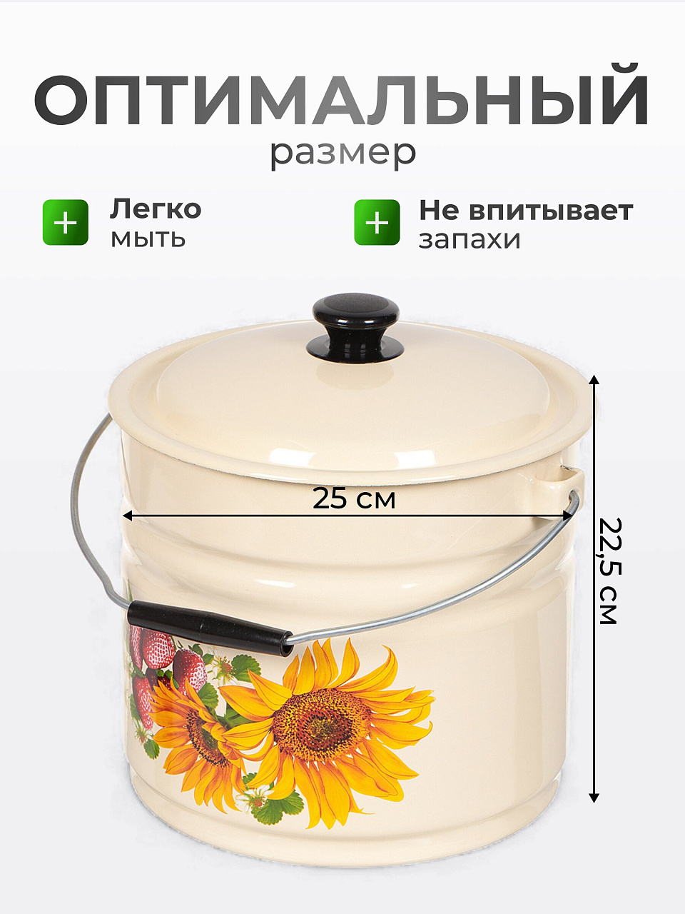 В отличие от пластиковых и алюминиевых аналогов, стальное ведро с эмалью сохраняет внешний вид дольше, не деформируется от перепадов температур и не вступает в реакцию с содержимым. Если вы спрашиваете, как использовать ведро с крышкой или подходит ли оно для хранения воды и продуктов — ответ: да, благодаря герметичной крышке и безопасному покрытию. Яркий рисунок с цветами и ассортимент цветов подойдут к любому интерьеру, а отсутствие сливного носика делает изделие более универсальным.