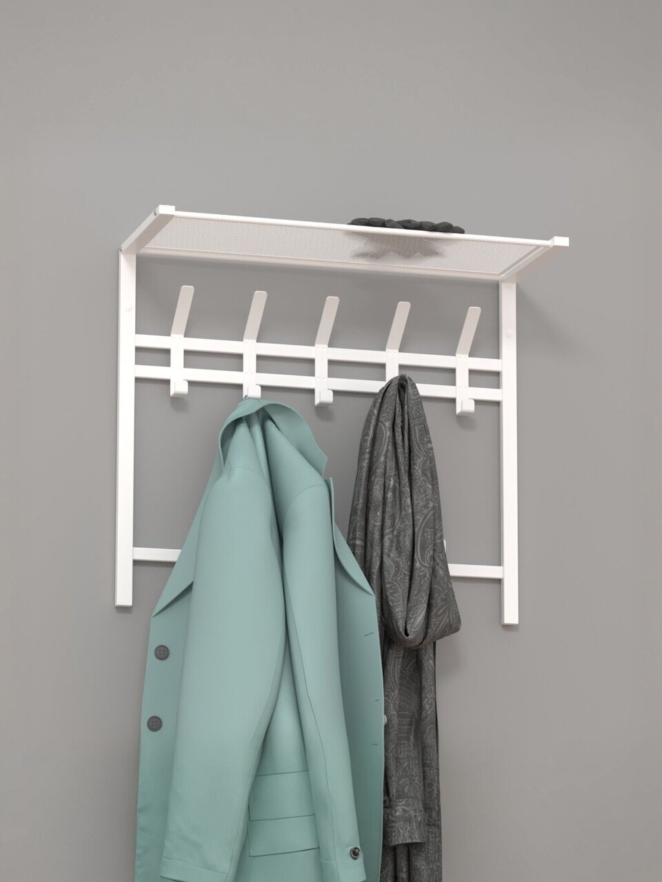 - На вешалке есть полка, которая позволяет хранить аксессуары, такие как шарфы, перчатки и другие мелочи.