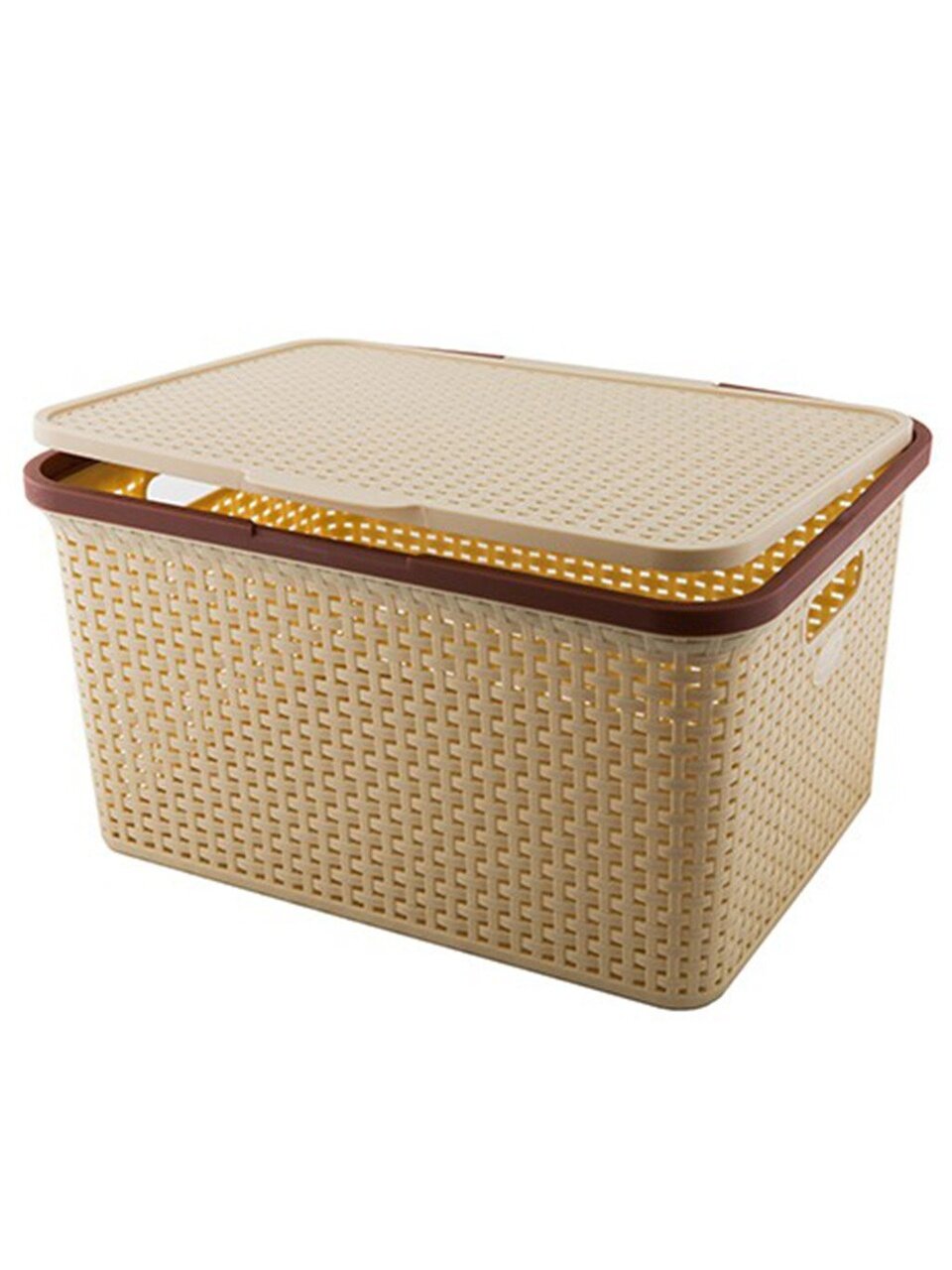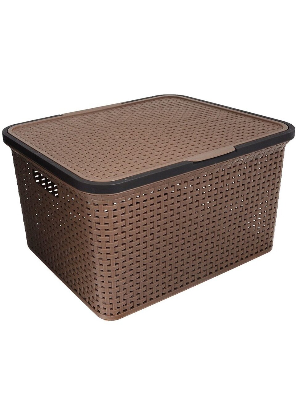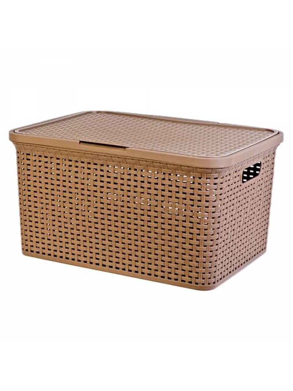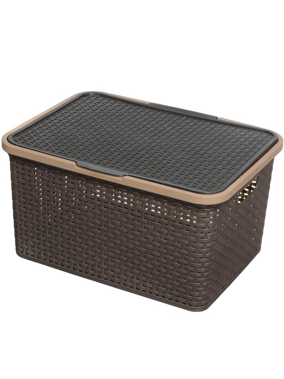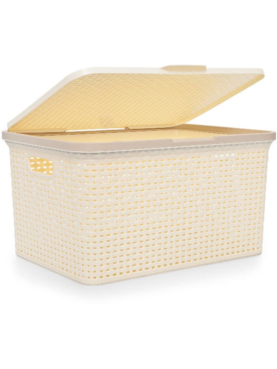 Цвет подбирается автоматически из ассортимента. Ящик оснащён крышкой и ручками для переноски, выполнен в плетёном дизайне, что повышает прочность и эстетичность.
